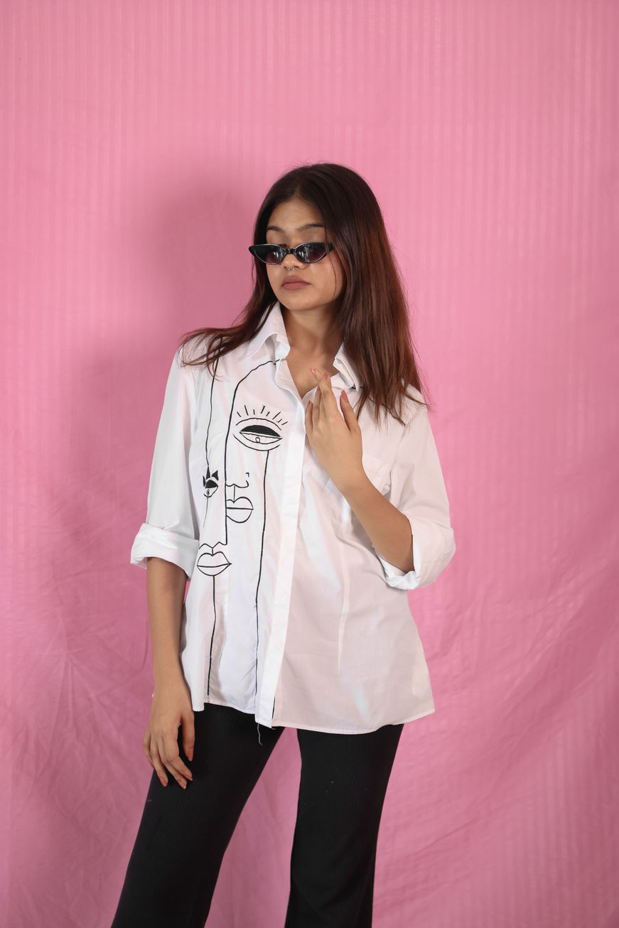 Elevate your everyday style with UptownDesi's white casual shirt, a perfect blend of simplicity and sophistication. Crafted with long sleeves and featuring a practical pocket on the left panel, this shirt is designed for both comfort and utility. The right panel showcases unique hand-embroidered line art, adding an artistic touch that sets this piece apart. Finished with straight hems, this shirt embodies UptownDesi's commitment to upcycling and creating one-of-a-kind fashion. Embrace sustainable elegance with this beautifully crafted shirt, perfect for any smart casual occasion.